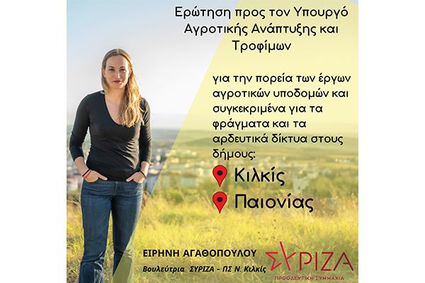 Συγκεκριμένα, τονίζονται στην ερώτησή της τα όσα είχε υποσχεθεί τον Οκτώβρη του 2020 ο τότε Υπουργός Αγροτικής Ανάπτυξης και Τροφίμων, κ. Σκρέκας, κατά την διάρκεια της περιοδείας του στην ΠΕ Κιλκίς και αφορούν τα φράγματα και τα αρδευτικά δίκτυα στους δήμους Παιονίας και Κιλκίς και ειδικά για τα έργα στη λίμνη Αρτζάν – Αματόβου, στο Φράγμα Σελεμλή, στις Μουρίες και στο Μεταξοχώρι.