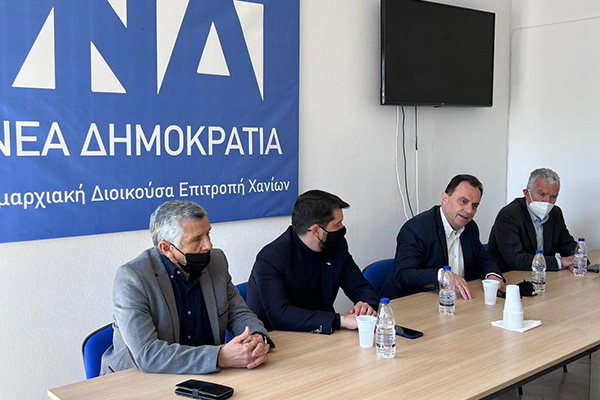 Στη συνέχεια πραγματοποιήθηκε ευρεία σύσκεψη με εκπροσώπους αγροτικών φορέων, γεωργούς, κτηνοτρόφους και μελισσοκόμους, με τη συμμετοχή των βουλευτών του νομού Χανίων, Ντόρας Μπακογιάννη και Μανούσου Βολουδάκη, καθώς και του Γ.Γ του ΥΠΑΑΤ, κ. Κώστα Μπαγινέτα.