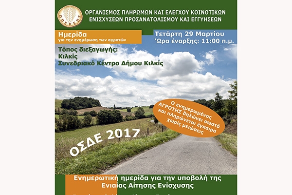 θα πραγματοποιήσει εκπαιδευτική ενημέρωση για τους αγρότες του Νομού Κιλκίς στο Κιλκίς, την Τετάρτη 29/03/2017 και ώρα 11:00 π.μ., στην Αίθουσα του Συνεδριακού Κέντρου του Δήμου Κιλκίς.