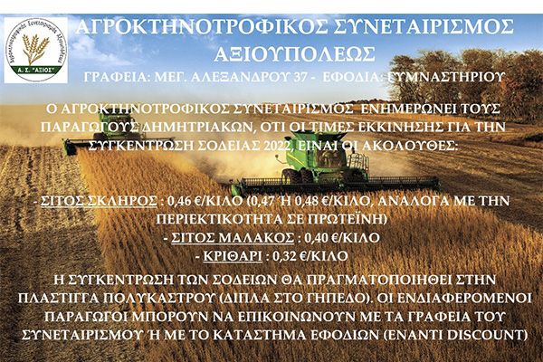 Η συγκέντρωση των προϊόντων θα ξεκινήσει από την Δευτέρα 6 Ιουνίου στην πλάστιγγα Πολυκάστρου (δίπλα στο γήπεδο. Ο Συνεταιρισμός Αξιούπολης προέβη στην εξαγγελία της τιμής στα σιτηρά καθώς έχει και σχετική συμφωνία με τη Σόγια Ελλάς. Πέρσι ο Συνεταιρισμός συγκέντρωσε περί τους 3.500 τόνους σιτηρών.