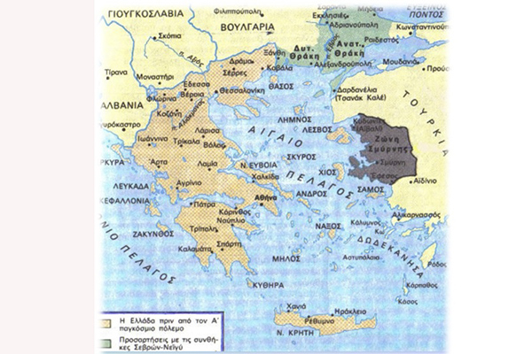Με τη Συνθήκη των Σεβρών, στην Ελλάδα παραχωρούνταν η Δυτική και Ανατολική Θράκη ως τη γραμμή Τσατάλτζας κοντά στην Κωνσταντινούπολη και τα νησιά Ιμβρος και Τένεδος, καθώς και η Σμύρνη με την ενδοχώρα της, όπου τυπικά αναγνωριζόταν η τουρκική κυριαρχία με το να κυματίζει η οθωμανική σημαία στα φρούρια της πόλης.