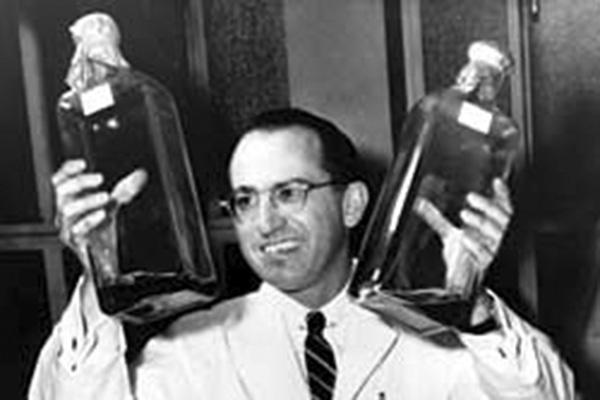 Φωτογραφία: Ο Έντουαρντ Τζόνας Σωλκ κρατάει δυο δοχεία εμβολίου κατά της πολυομελίτιδας