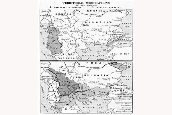 Χάρτης των Βαλκανίωνς μετά την Συνδιάσκεψη του Λονδίνου (1913) και μετά την Συνθήκη του Βουκουρεστίου (1913)