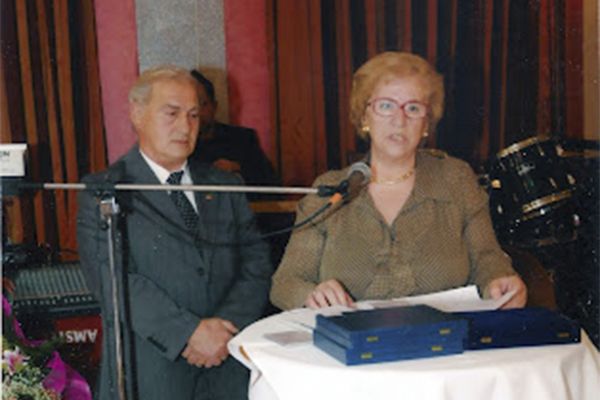 Ο τότε Δήμαρχος Πολυκάστρου Δ. Σμυδάκης επιδίδει τιμητική πλακέτα στην Άννα Μουρουγλάκη