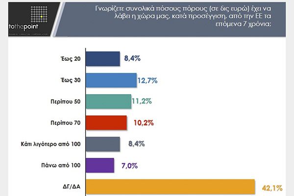 Το 42,1% των πολιτών δεν γνωρίζει συνολικά πόσους πόρους (σε δις ευρώ) έχει να λάβει η χώρα μας, κατά προσέγγιση, από την ΕΕ τα επόμενα 7 χρόνια. Από τους υπόλοιπους που δίνουν συγκεκριμένες απαντήσεις, έως 20 δις απαντά το 8,4%, έως 30 δις ευρώ απαντά το 12,7%, περίπου 50 δις απαντά το 11,2%, περίπου 70 δις απαντά το 10,2%, λιγότερα από 100 δις απαντά το 8,4% και πάνω από 100 δις ευρώ απαντά το 7%. Από τις απαντήσεις προκύπτει ότι επικρατεί άγνοια και σύγχυση για το συνολικό ύψος των ευρωπαϊκών πόρων που θα λάβει η χώρα, με σχεδόν μόλις 1 στους 10 πολίτες να μπορεί να απαντήσει συγκεκριμένα και σωστά σε αυτό το ερώτημα.