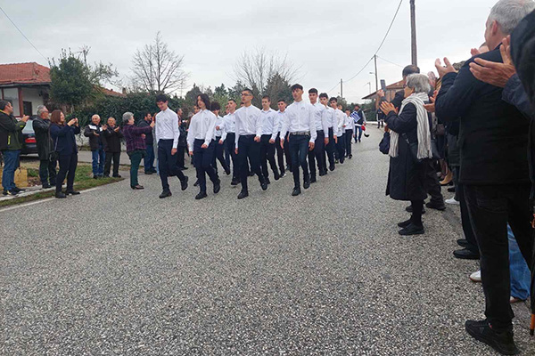Μαθητές και συνοδοί μετά τον εκκλησιασμό τους στον ιερό ναό κοιμήσεως της Θεοτόκου και την επιμνημόσυνη τελετή στο ηρώο του χωριού όπου κατέθεσαν στεφάνι με αφετηρία τον κλειστό από το 2009 σχολείο, παρήλασαν οι μαθητές χειροκροτούμενη θερμά από τους κατοίκους και όλους τους παρευρισκόμενους.