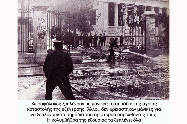 Και μετά στρατοδικείο κι εξορία κατά την προσφιλή τακτική του μετεμφυλιακού κράτους. Τρομοκρατία με επισκέψεις πόρτα – πόρτα για να ανακαλυφθούν όσοι διέφυγαν, όσοι τους έδωσαν άσυλο, όσοι ήταν συγγενείς και έπρεπε να κρατήσουν το στόμα τους ερμητικά κλειστό για να μην πάθουν τα ίδια. Και φυσικά διαπόμπευση τηλεοπτική ή δια του Τύπου και αμφισβήτηση ότι υπήρξε έστω και ένας νεκρός. Για να ξεχαστούν οι αγωνιώδεις εκκλήσεις του ραδιοφωνικού σταθμού των φοιτητών, οι προκηρύξεις οι τυπωμένες στον πολύγραφο, τα συνθήματα στα πλακάτ, τα οδοφράγματα. Να ο μακρύς κατάλογος δεινών που συνόδεψαν την εξέγερση.