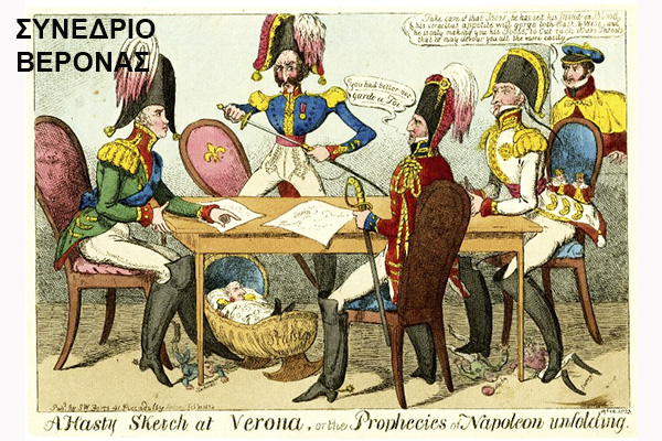Στο Συνέδριο της Βερόνα η ισπανική επανάσταση επισκίασε το ελληνικό ζήτημα που κατά συνέπεια αφέθηκε στην άκρη. Ακόμη κι οι αντιπρόσωποι των Ελλήνων επαναστατών ‘’καθηλώθηκαν’’ στην Αγκόνα με εντολή Μέτερνιχ στις αυστριακές αρχές και δεν τους επετράπη να μεταβούν στο συνέδριο όπου είχαν σκοπό να παρουσιάσουν πρόταση για τη διακυβέρνηση της επαναστατημένης χώρας τους υπό μοναρχικό καθεστώς. Παρόλα αυτά η αξία της συνδιάσκεψης για την ελληνική επανάσταση έγκειται στο εγχειρίδιο των βρετανικών θέσεων, υπογεγραμμένο από τον Κάσλρεη περί αυστηρής ουδετερότητας της χώρας του στην ελληνοτουρκική διένεξη. Η Βρετανία θα αναγνώριζε τους Έλληνες ως εμπόλεμους μόνο στην περίπτωση που αποτύγχαναν οι Οθωμανοί να κατασβέσουν τις επαναστατικές φλόγες και δυνητικά θα μπορούσε να εμπλακεί στην ελληνική υπόθεση, εάν σχηματιζόταν μια ντε φάκτο κυβέρνηση στο Μωριά, χωρίς όμως να της παρασχεθεί καμία εγγύηση. Έχοντας υπό μάλης και τις οδηγίες του φιλελεύθερου διαδόχου του υπ.΄Εξωτερικών Γ. Κάννινγκ, που αντικατέστησε τον αυτόχειρα Κάσλρεη, ο δούκας Ουέλιγκτον, που εκπροσώπησε τη Βρετανία στη Βερόνα, κατέστησε σαφές ότι η Αυτού Μεγαλειότης δε θα έπαιρνε μέρος σε πολεμικά σενάρια ενώ παρότρυνε την Πύλη να προχωρήσει στην αποκλιμάκωση της έντασης και στην ειρήνευση της περιοχής της. Οι διαφορές Ρωσίας – Πύλης αμβλύνθηκαν χάρη στην παρέμβαση Βρετανίας – Αυστρίας. Ο τσάρος δε θα κήρυττε πόλεμο κατά της Οθωμανικής Αυτοκρατορίας για χάρη των Ελλήνων επαναστατών γιατί μετρώντας τις αντιδράσεις των συμμάχων είχε συνειδητοποιήσει ότι δε μπορούσε να τους επιβληθεί. Θύμα των διαβουλεύσεων πριν από το συνέδριο της Βερόνας υπήρξε ο Έλληνας υπουργός Εξωτερικών της τσαρικής αυλής Αντώνιος – Ιωάννης Καποδίστριας που παραιτήθηκε από το αξίωμά του για να διευκολύνει την εξωτερική πολιτική του Αλεξάνδρου Α’ η οποία ήταν εχθρική για την ιδιαίτερη πατρίδα του.