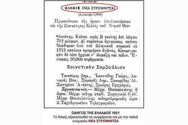 Αυτό όμως δεν οριστικοποιήθηκε, γιατί το Ελληνικό κράτος αποφάσισε να διατηρήσει το όνομα του Κιλκίς, που είχε συνδεθεί με την ιστορική μάχη από την οποία κρίθηκε η τύχη του Β’ Βαλκανικού πολέμου. Η ιστορική «ειρωνεία» είναι ότι η πολυαίμακτη μάχη που είχε ως αποτέλεσμα τη διάρρηξη των δεσμών της πόλης με το παρελθόν της στάθηκε ταυτόχρονα η αιτία να διατηρηθεί το όνομα που τη συνέδεε με το παρελθόν αυτό. Με την ονομασία Κιλκίς εμφανίζεται η κωμόπολη σε πίνακα που παρουσιάζει «τας εν τη Υποδιοικήσει Κιλκίς υπαγομένας πόλεις, κώμας και χωρία μετά των τυχόν εν αυταίς εγκατεστημένων Αρχών» και υπογράφεται από τον υποδιοικητή Κιλκίς στις 16-11-1914 στοιχείο που δείχνει ότι για την ελληνική διοίκηση η ονομασία Νέα Στρώμνιτσα δεν ισχύει. Πάντως η προσωρινή αυτή ονομασία θα συνεχίσει να επιβιώνει και στα επόμενα χρόνια όπου όμως επιλέγεται ως δεύτερη όπως συμβαίνει με τον Οδηγό της Ελλάδος του 1921.