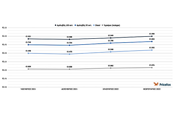 Συνεχίζεται το Ράλι τιμών με τις στην απλή αμόλυβδη να φτάνει από 1,749€/λίτρο στο 1,844€/λίτρο ενώ παράλληλα η ενισχυμένη βενζίνη αγγίζει σχεδόν τα 2€/λίτρο μέσα στον Φεβρουάριο. Η μέση τιμή για τους οδηγούς πετρελαιοκίνητων αγγίζει το 1,592€/λίτρο από 1,498€/λίτρο που ήταν το Νοέμβριο. Η μεγαλύτερη έκπληξη είναι οι τιμές του υγραερίου που φτάνουν το 1,076€/λίτρο ενώ τέσσερις μήνες πριν η μέση τιμή ήταν στο 1,034€/λίτρο.