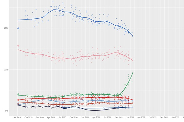 Το τρίτο ενδιαφέρον στοιχείο -και παρά τους διθυράμβους των περισσοτέρων ΜΜΕ περί απόλυτης κυριαρχίας του κου Μητσοτάκη- βρίσκεται στο διάγραμμα των δημοσκοπήσεων από το 2019, στο οποίο η ΝΔ έχει συγκριτικά το χαμηλότερο καταγραφόμενο ποσοστό. Παρά την προσπάθεια δημιουργίας κλίματος, οι αριθμοί είναι αμείλικτοι και επισημαίνουν το πραγματικό πρόβλημα μίας πορείας που τείνει να αποκτήσει φθίνοντα ρυθμό (η αποτίμηση διαχείρισης της πανδημίας θα παίξει σημαντικό ρόλο και εκεί πλέον η εικόνα έχει αντιστραφεί για την κυβέρνηση).