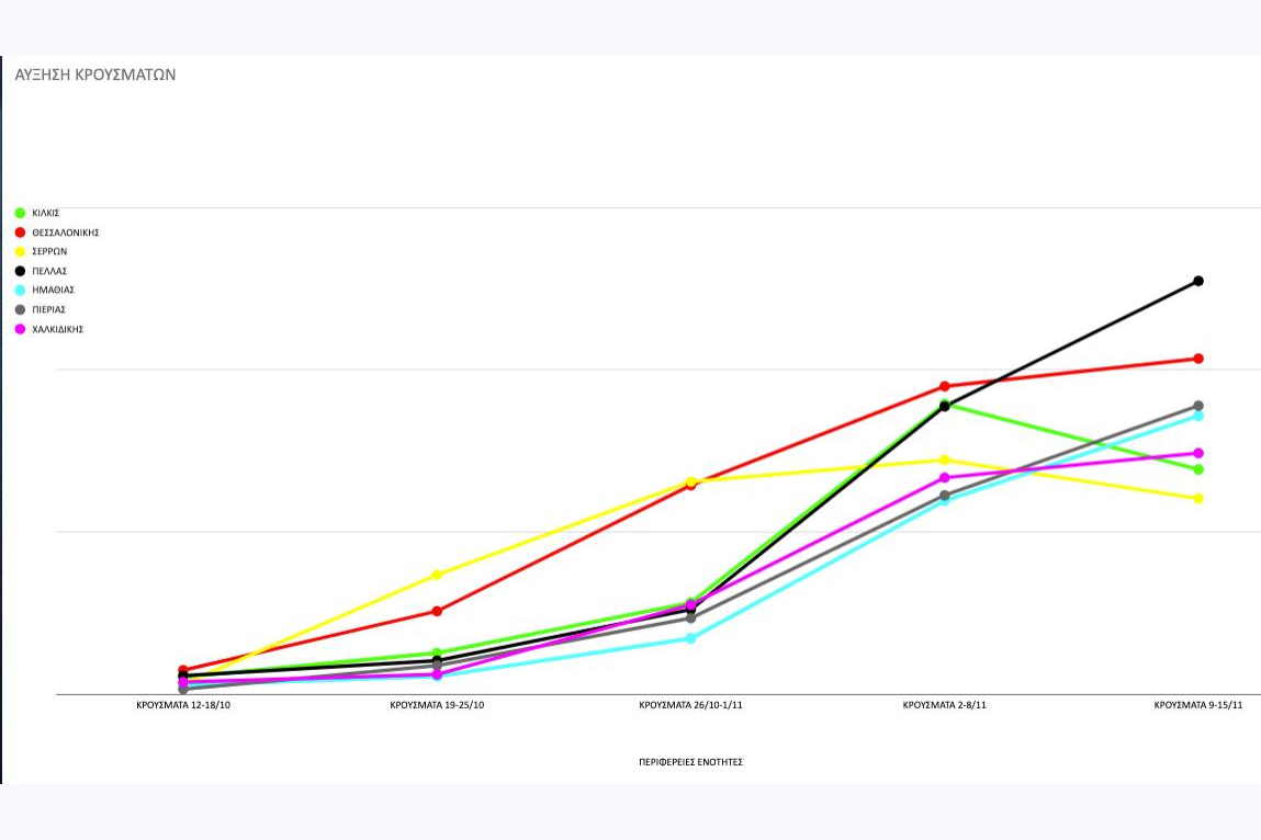 Η Χαλκιδική είναι η περιφερειακή ενότητα με τα καλύτερα επιδημιολογικά δεδομένα, ενώ οι Σέρρες είχαν το υψηλότερο πικ, κάτι που έφερε τις υγειονομικές δομές στα όριά τους σε μικρό χρονικό διάστημα. Η δε Πιερία δείχνει να ακολουθεί μία δύσκολη αλλά πιο σταθερή πορεία.