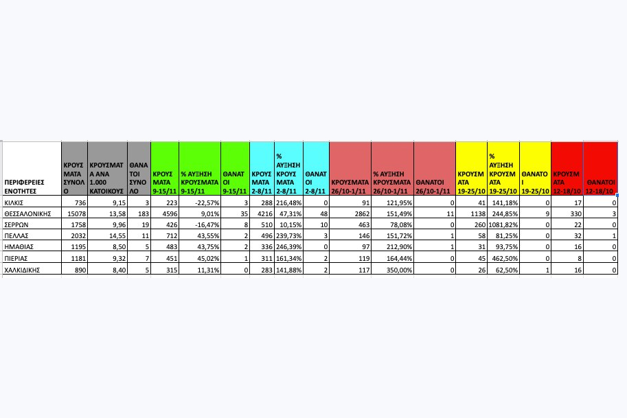 Στον επισυναπτόμενο πίνακα παραθέτω την πορεία των κρουσμάτων-θανάτων ανά εβδομάδα στην περιοχή της Κεντρικής Μακεδονίας και τον συνολικό αριθμό κρουσμάτων.