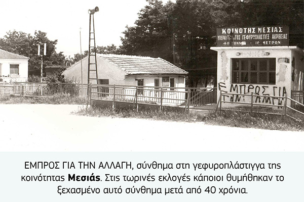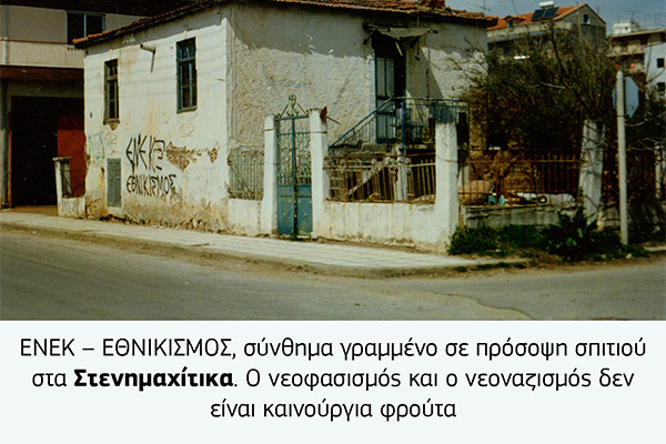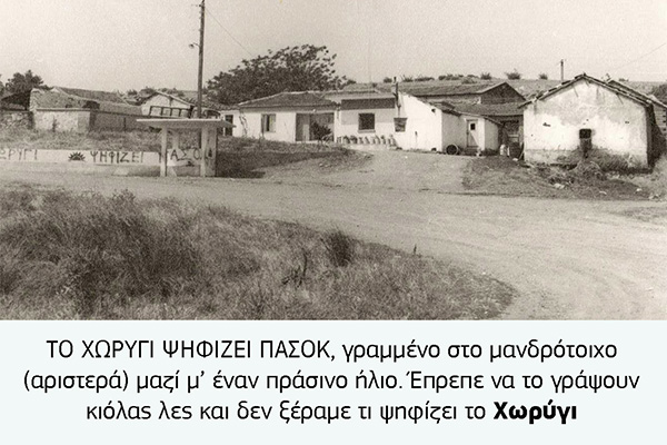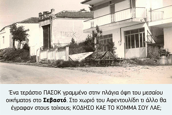 Φυσικά δεν ήταν μόνο οι αφίσες που έκαναν τους τοίχους να αναστενάζουν αλλά και τα συνθήματα που γράφονταν με σπρέι ή λαδομπογιά. Ενίοτε εκτός από τα ντουβάρια βάφονταν και τα πεζοδρόμια, με πιο χαρακτηριστική περίπτωση το Νέο Γυναικόκαστρο όπου τα πεζοδρόμια βάφονταν μπλε ακόμη και σε μη προεκλογικές περιόδους.