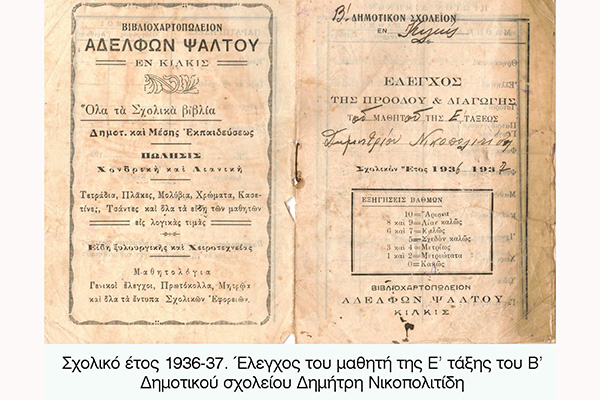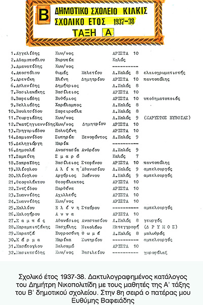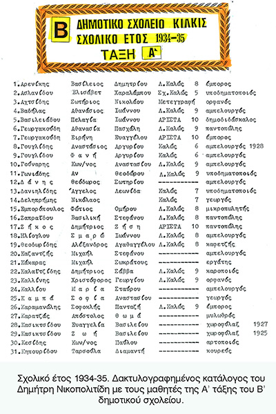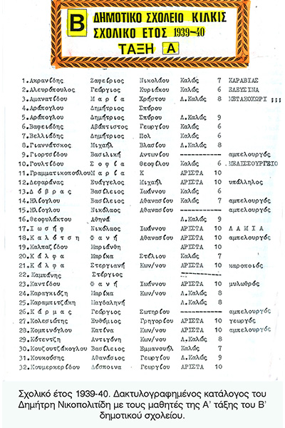 Μην παραλείψετε να δείτε από το υλικό που παραθέτω τους καταλόγους με τα ονόματα των μαθητών της Α’ τάξης των σχολικών ετών 1934-35, 1937-38, 1939-40. Πιθανόν, κάποιοι από σας να βρείτε τα ονόματα των παππούδων ή των πατεράδων σας καθώς και το βαθμό του απολυτηρίου τους.