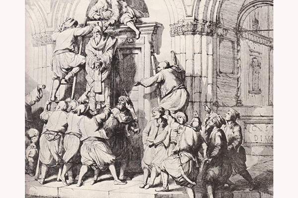 Την Μεγάλη Δευτέρα, 4η Απριλίου έφτασε και η είδηση για τον ξεσηκωμό της Στερεάς Ελλάδος. Η αναμενόμενη οργή του Σουλτάνου έπεσε πρώτα επάνω στους Φαναριώτες και στην συνέχεια στους ιερωμένους. Η Μεγάλη Εβδομάδα ήταν η εβδομάδα των παθών για τους Έλληνες. Μακρύς είναι ο κατάλογος των δολοφονημένων. Άλλους απαγχόνιζαν και άλλους αποκεφάλιζαν. Τον Μέγα Διερμηνέα Κωνσταντίνο Μουρούζη τον αποκεφάλισαν και πέταξαν το πτώμα του στον Βόσπορο. Τον πατριάρχη Γρηγόριο τον Ε’ τον απαγχόνισαν στην μεσαία πύλη του πατριαρχείου την 10η Απριλίου, Κυριακή του Πάσχα. Κρέμασαν από τον λαιμό του και το κατηγορητήριο, ότι δηλαδή γεννήθηκε στην Πελοπόννησο ‘’οπού κατά πρώτον εξερράγη η επανάστασις’’. Το νεκρό σώμα έμεινε κρεμασμένο στην αγχόνη επί τρείς ημέρες και πλήθος μουσουλμάνων κατέφθασε στο Πατριαρχείο για να το δεί, να το βρίσει, να το χλευάσει, να το κτυπήσει, να του πετάξει αντικείμενα. Κάποιος μάλιστα το πυροβόλησε. Την Τρίτη της Διακαινησίμου κατέβασαν το πτώμα από την αγχόνη, το γύμνωσαν, το ποδοπάτησαν και το έσυραν μέχρι την ακτή. Ένα πλοιάριο το τράβηξε στην μέση του Κεράτιου κόλπου και με το βάρος μιας πέτρας το έστειλε στον βυθό. Το πτώμα περισυνέλλεξε ελληνικό πλοίο και το μετέφερε στην Οδησσό όπου και το έθαψαν με μεγάλες τιμές.