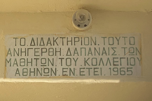 «Το διδακτήριο τούτο ανηγέρθη δαπάναις των μαθητών του κολλεγίου Αθηνών εν έτη 1965»