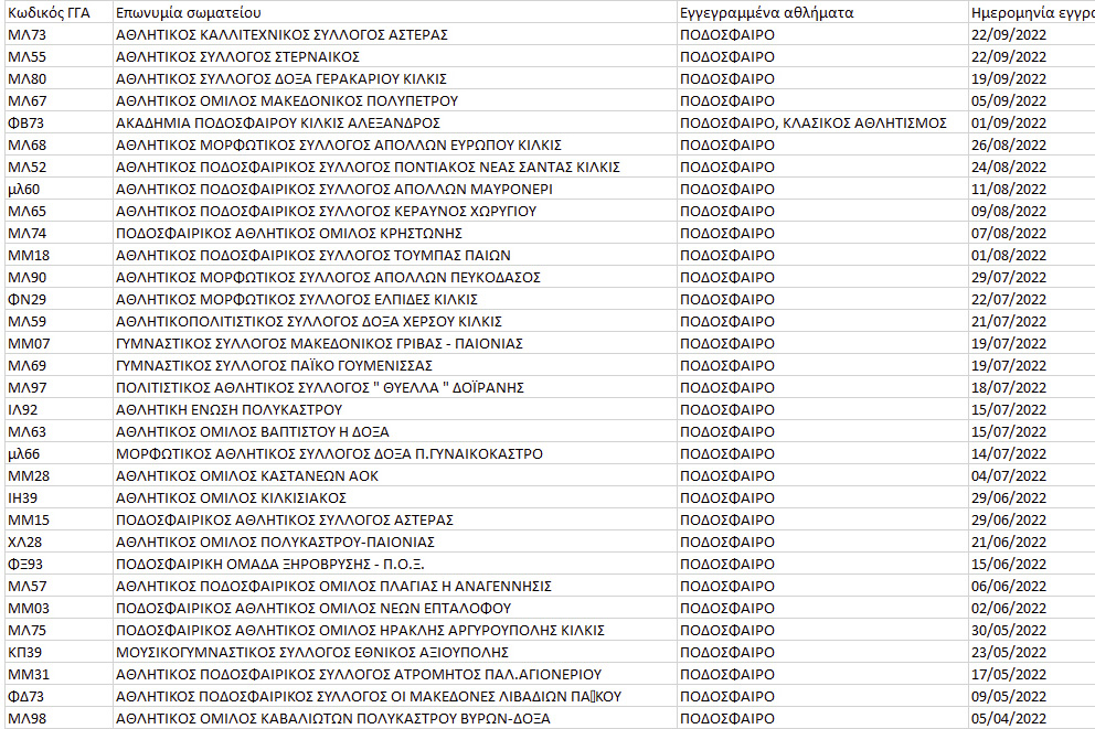 Από το νομό Κιλκίς στο Μητρώο έχουν εγγραφεί όλες οι ομάδες, με την καθοριστική βοήθεια και της ΕΠΣ Κιλκίς. Με την ευκαιρία καταγράφουμε και τα 32 σωματεία του νομού Κιλκίς που έχουν εγγραφεί στο Μητρώο, όπως αυτά παρουσιάζονται στον σχετικό πίνακα.