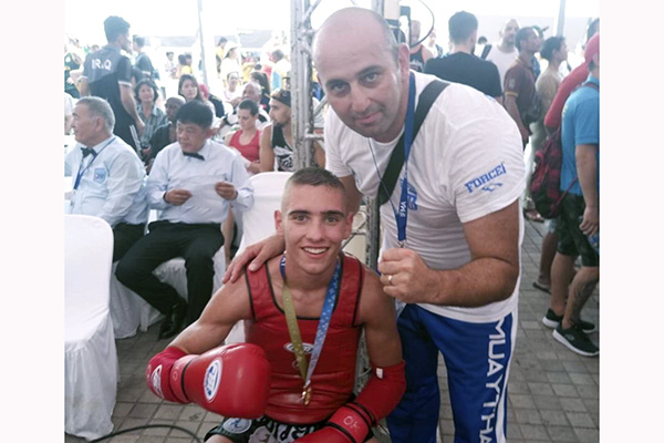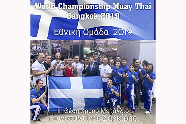 Ο προπονητής εθνικής ομάδας Πουντζουκίδης Κωνσταντίνος συγχαίρει τον αθλητή Σαρκίρη Κωνσταντίνο για την εξαιρετική εμφάνισή του και την κατάκτηση της 1ης θέσης Χρυσού μεταλλίου στο Παγκόσμιο Πρωτάθλημα Muay Thai στην Bangkok.