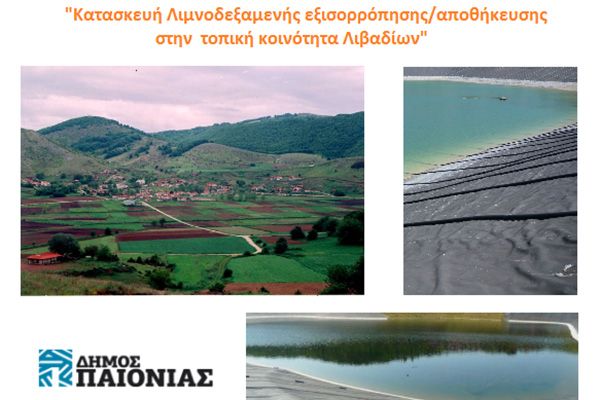 Αντικείμενο του προτεινόμενου έργου είναι η κατασκευή μιας στεγανοποιημένης δεξαμενής αποθήκευσης νερού, όγκου 17.000 m3, στη δημοτική ενότητα Λιβαδιών του δήμου Παιονίας. Η νέα λιμνοδεξαμενή θα συγκοινωνεί με την υφιστάμενη μικρή λιμνοδεξαμενή και με το υφιστάμενο αρδευτικό κανάλι.