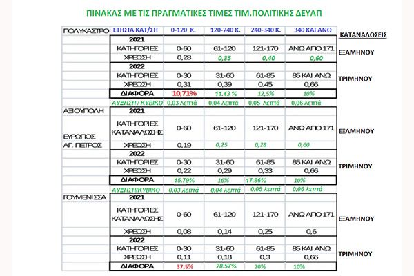 Οι πολίτες του δήμου Παιονίας πρέπει να γνωρίζουν ότι η ΔΕΥΑΠ αύξησε το τιμολόγιο του νερού στο ελάχιστο δυνατόν, για να αντιμετωπίσει ένα μέρος μόνο των επιβαρύνσεων στο κόστος λειτουργίας της, από την ενεργειακή κρίση (ΔΕΗ, καύσιμα κλπ) που είναι 150.000 ευρώ.