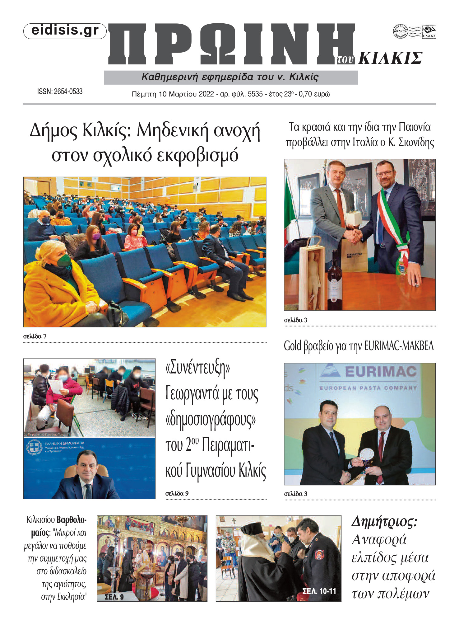 Διαβάστε το νέο πρωτοσέλιδο της Πρωινής του Κιλκίς, μοναδικής καθημερινής εφημερίδας του ν. Κιλκίς (10-3-2022)