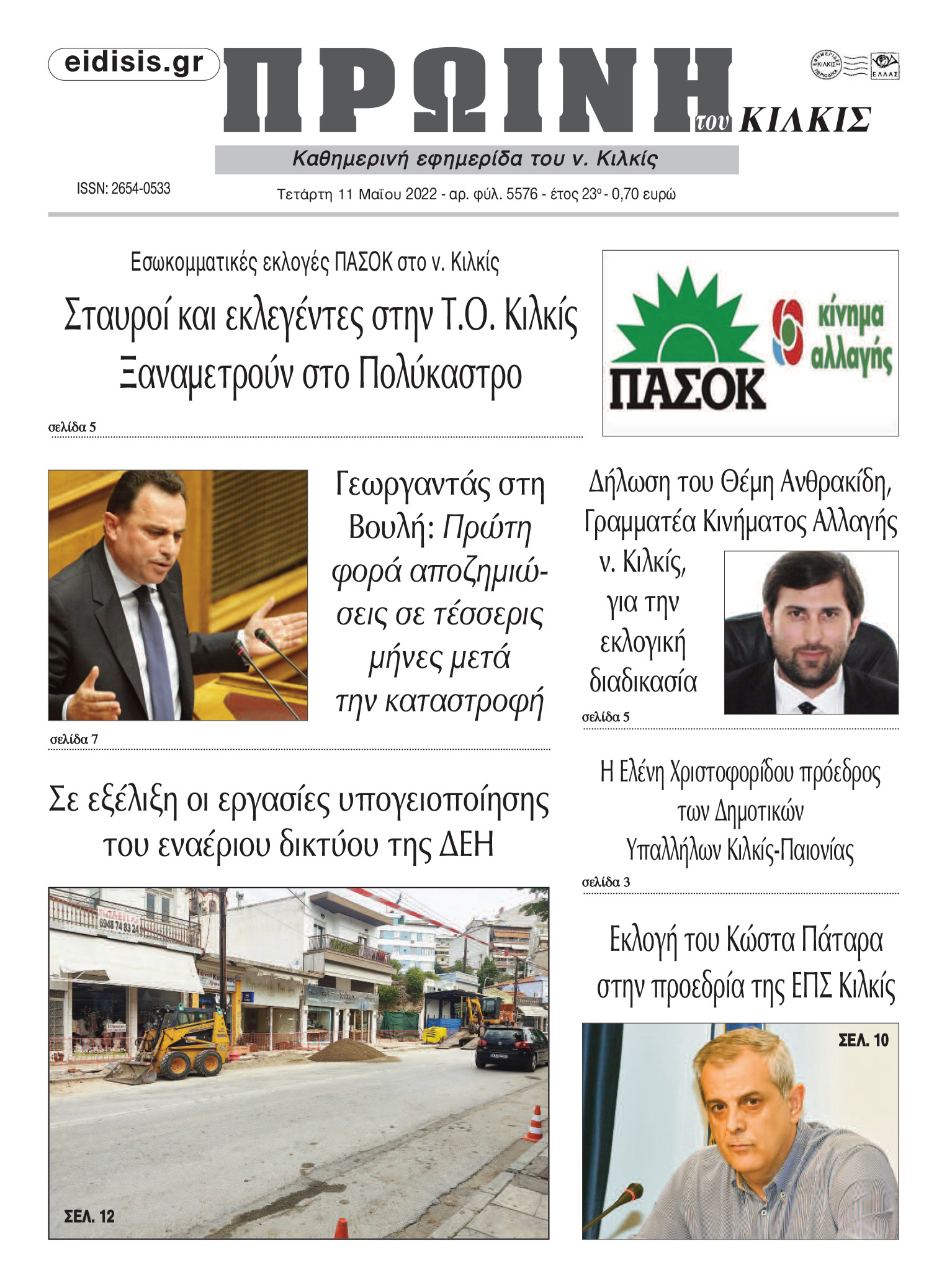 Διαβάστε το νέο πρωτοσέλιδο της Πρωινής του Κιλκίς, μοναδικής καθημερινής εφημερίδας του ν. Κιλκίς (11-5-2022)