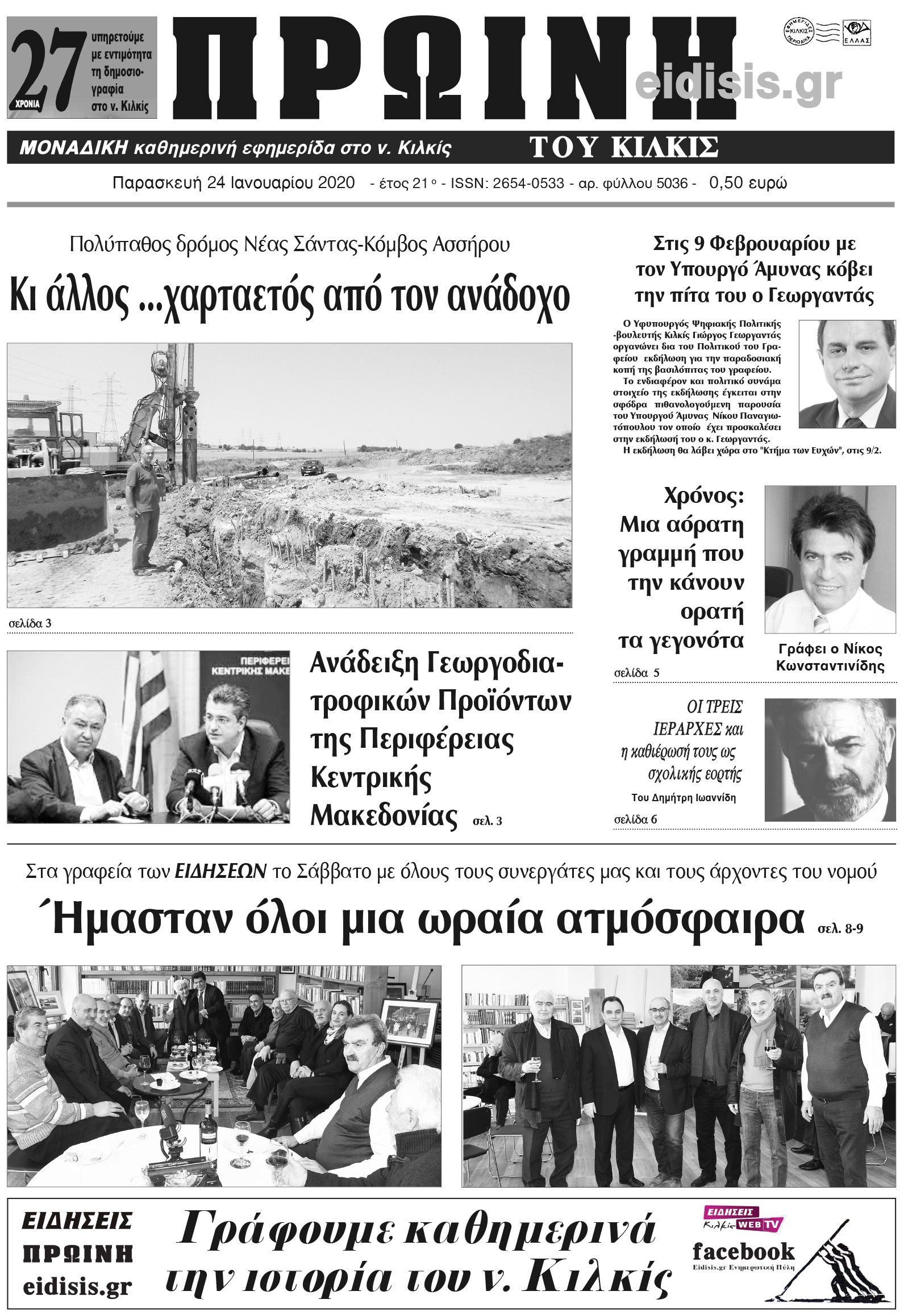 Διαβάστε το νέο πρωτοσέλιδο της Πρωινής του Κιλκίς, μοναδικής καθημερινής εφημερίδας του ν. Κιλκίς (24-1-2020)
