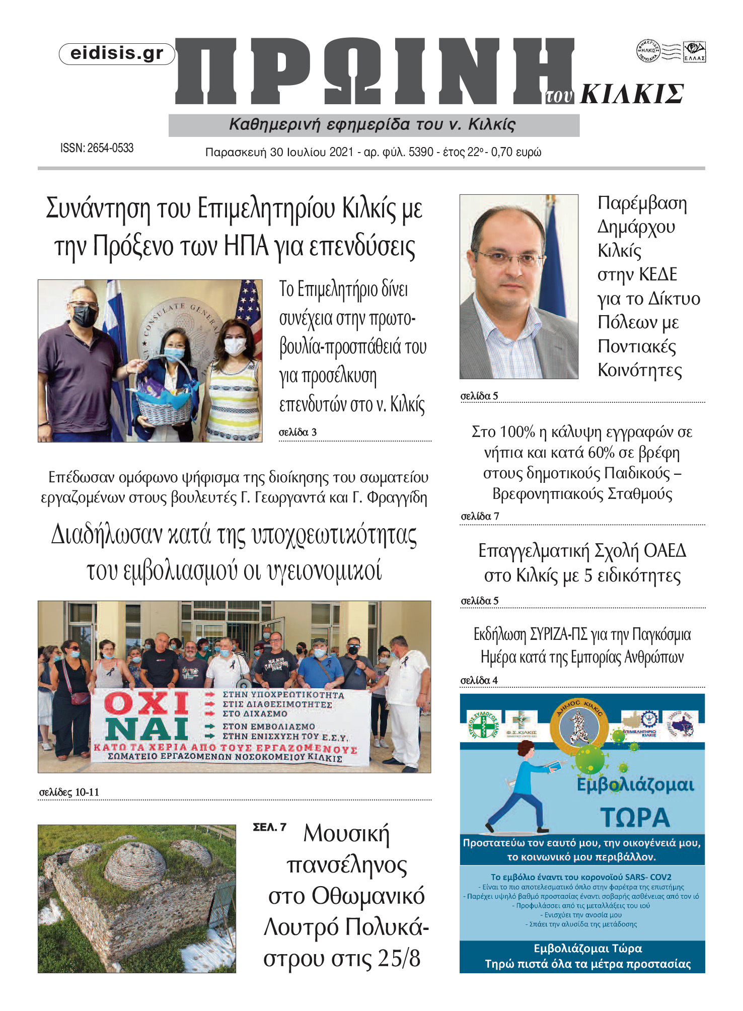Διαβάστε το νέο πρωτοσέλιδο της Πρωινής του Κιλκίς, μοναδικής καθημερινής εφημερίδας του ν. Κιλκίς (30-7-2021)