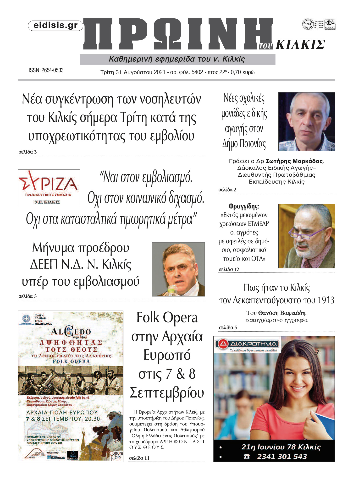 Διαβάστε το νέο πρωτοσέλιδο της Πρωινής του Κιλκίς, μοναδικής καθημερινής εφημερίδας του ν. Κιλκίς (31-8-2021)