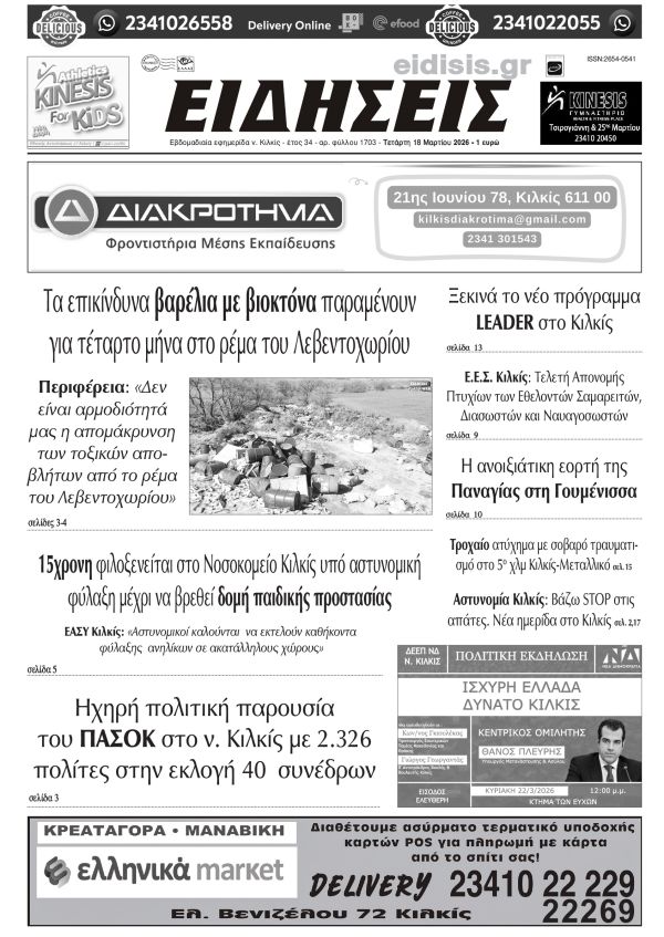 Διαβάστε το νέο πρωτοσέλιδο των ΕΙΔΗΣΕΩΝ του Κιλκίς, της εβδομαδιαίας εφημερίδας του ν. Κιλκίς (18-3-2026)