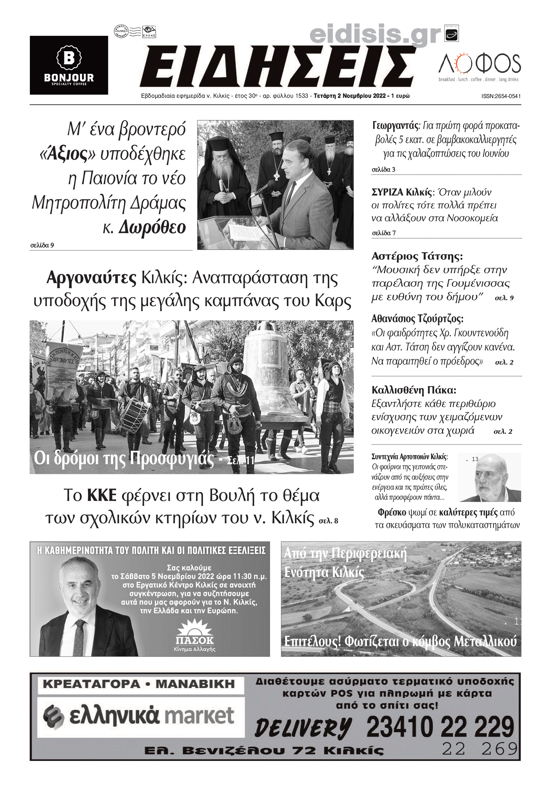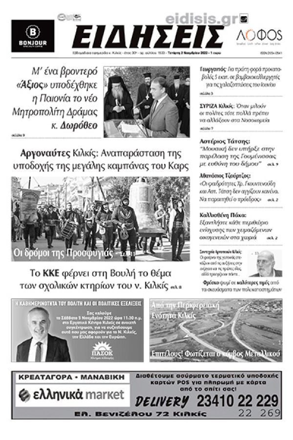 Διαβάστε το νέο πρωτοσέλιδο των ΕΙΔΗΣΕΩΝ του Κιλκίς, της εβδομαδιαίας εφημερίδας του ν. Κιλκίς (2-11-2022)