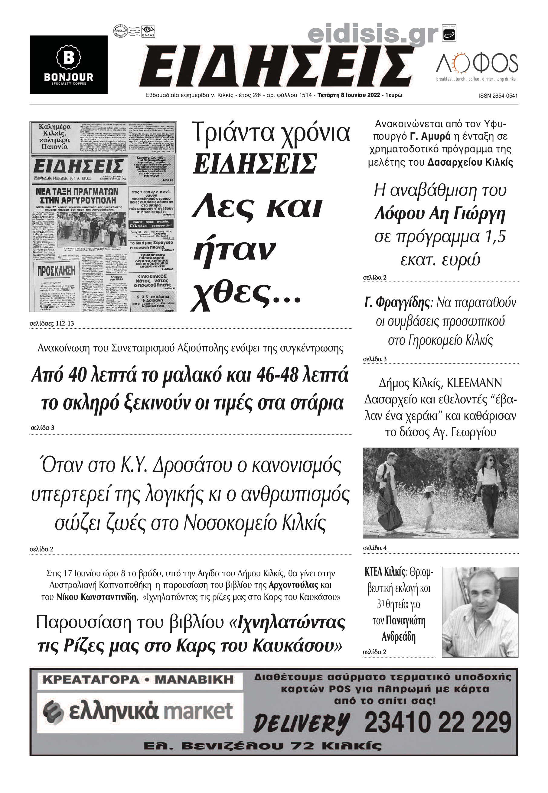 Διαβάστε το νέο πρωτοσέλιδο των ΕΙΔΗΣΕΩΝ του Κιλκίς, της εβδομαδιαίας εφημερίδας του ν. Κιλκίς (8-6-2022)