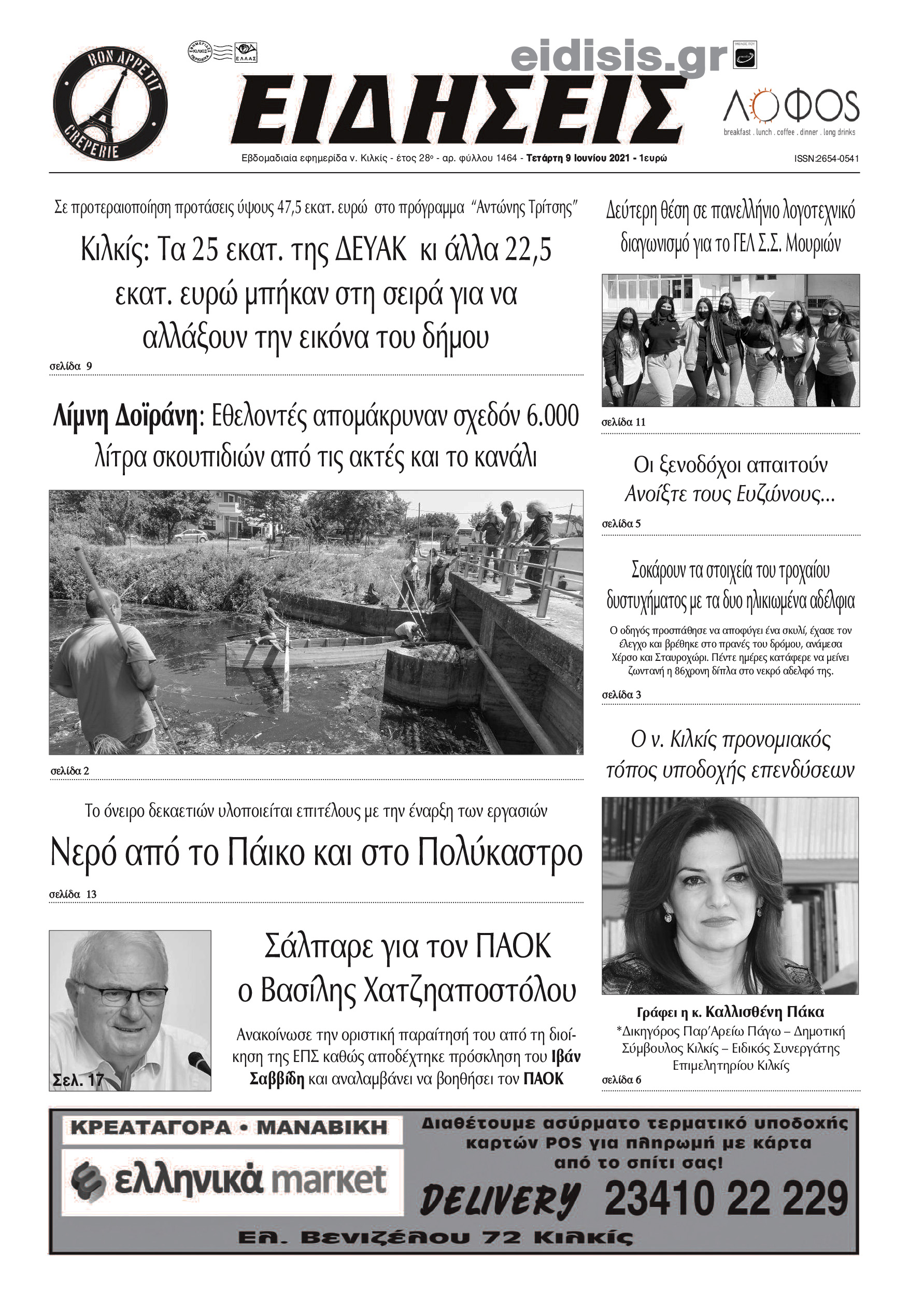 Διαβάστε το νέο πρωτοσέλιδο των ΕΙΔΗΣΕΩΝ του Κιλκίς, της εβδομαδιαίας εφημερίδας του ν. Κιλκίς (9-6-2021)