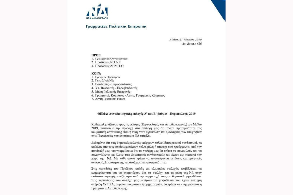 Αυτά προκύπτουν από το έγγραφο του Γραμματέα Πολιτικής Επιτροπής της Νέας Δημοκρατίας, Λευτέρη Αυγενάκη, που εστάλει στους προέδρους ΝΟ.Δ.Ε., προέδρους ΔΗΜ.Τ.Ο., Γραμματέα Οργανωτικού και Βουλευτές, υποψήφιους Βουλευτές (Αρ.Πρωτ. 626 / 21 Μαρτίου 2019). Επισυνάπτεται το εν λόγω έγγραφο.
