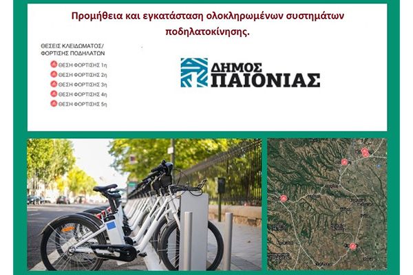 Δημιουργία δικτύου 5 σημείων, κοινόχρηστων θέσεων κλειδώματος και φόρτισης ποδηλάτου, με δυνατότητα αυτόματης φόρτισης του ποδηλάτου όσο είναι κλειδωμένο. (Πολύκαστρο , Γουμένισσα, Αξιούπολη, Εύρωπο).
