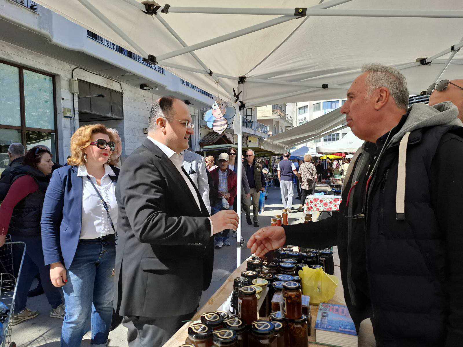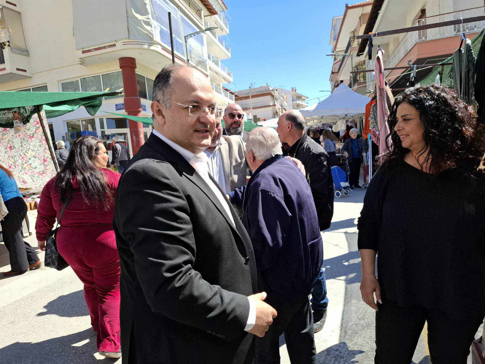 Στον χώρο της λαϊκής αγοράς τον συνόδευαν και οι Αντιδήμαρχοι Αλέξανδρος Σημαιοφορίδης, Γιώργος Μπαλάσκας, Θεμιστοκλής Κοσμίδης, Θεμιστοκλής Ανθρακίδης Ελένη Πατλάκη, ο εντεταλμένος δημοτικός σύμβουλος Νικόλαος Αβραμίδης και αντάλλαξαν και αυτοί ευχές με τους εκθέτες.