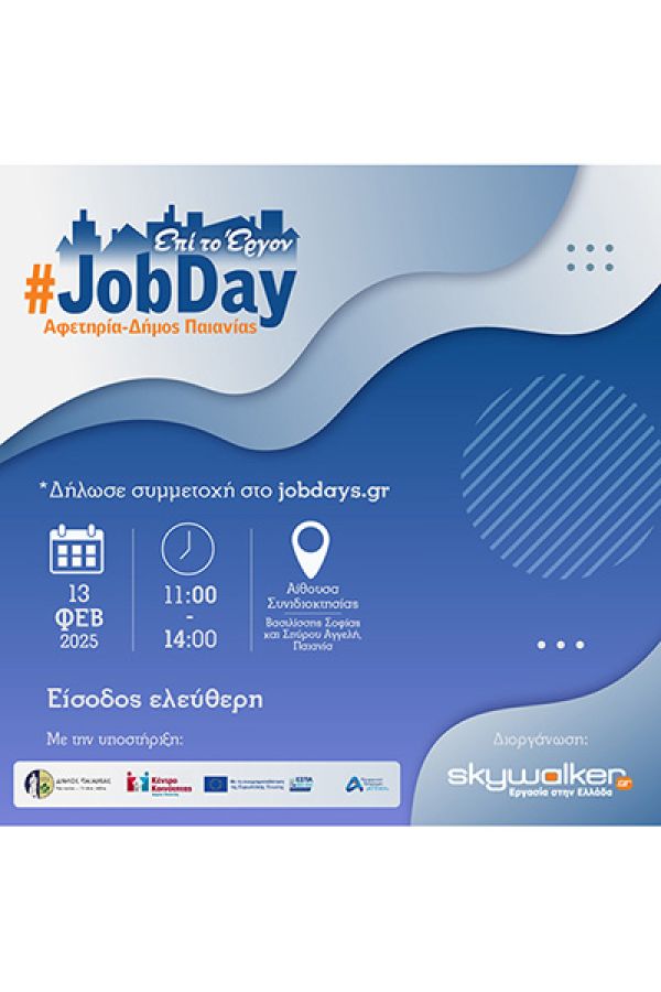 Tο #JobDay Αφετηρία – Δήμος Παιανίας πραγματοποιείται στο πλαίσιο της πρωτοβουλίας «Ξάδερφος Skywalker». Απευθύνεται σε όσους αναζητούν εργασία ή σκέφτονται να αλλάξουν επάγγελμα και θέλουν να βελτιώσουν τις γνώσεις και τις δεξιότητές τους. Μέσα από ενδιαφέρουσες εισηγήσεις οι ενδιαφερόμενοι που θα παρακολουθήσουν τα σεμινάρια θα λάβουν όλες εκείνες τις πληροφορίες που θα τους βοηθήσουν να γίνουν περιζήτητοι στην αγορά εργασίας.