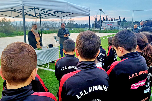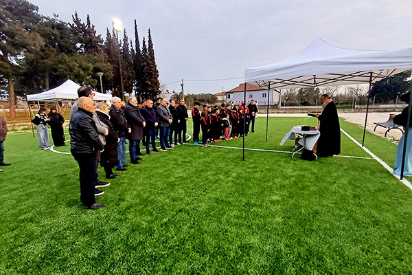 Την τελετή των εγκαινίων ευλόγησε ο εφημέριος του Ιερού Ναού Αγίου Γεωργίου του οικισμού π. Χαράλαμπος Ιακωβίδης, με ευχαριστήριες στη Δημοτική Αρχή και νουθεσίες στους νέους να αθλούνται και να χαίρονται στο καινούριο γήπεδο, πετώντας μακριά... τη μπάλα του ανταγωνισμού.