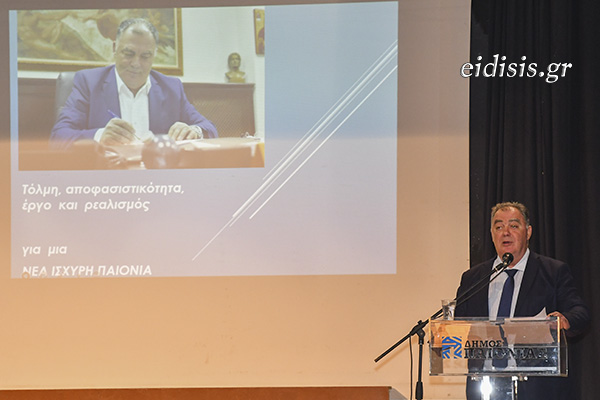 "...Σήμερα έχουμε μπροστά μας μια επιλογή, τόνισε. Να συνεχίσουμε να αφήνουμε τις αποφάσεις που καθορίζουν το μέλλον του Δήμου μας, σε άλλους, ή, να δώσουμε στη κοινωνία μία άλλη επιλογή. Να αλλάξουμε επιτέλους αυτά που μας ενοχλούν, αυτά που μας πληγώνουν. ΝΑ ΦΕΡΟΥΜΕ ΤΗΝ ΑΛΛΑΓΗ. Με αυτές τις σκέψεις, εξαγγέλλουμε σήμερα την ΕΠΑΝΙΔΡΥΣΗ του δημοτικού μας συνδυασμού, ο οποίος θα λάβει μέρος στις προσεχείς δημοτικές εκλογές για το δήμο Παιονίας. Ο τίτλος του συνδυασμού θα είναι: «ΝΕΑ ΙΣΧΥΡΗ ΠΑΙΟΝΙΑ». Ο τίτλος αυτός επιλέχτηκε όχι μόνο επειδή παραπέμπει στο όραμά μας για έναν Ισχυρό Δήμο Παιονίας, όσο για να συμβολίσει τη δυνατότητα που έχει ο δημοτικός μας συνδυασμός για να προσφέρει προοπτική για το δήμο και βάσιμες ελπίδες για ένα καλύτερο αύριο σε όλους τους δημότες..".