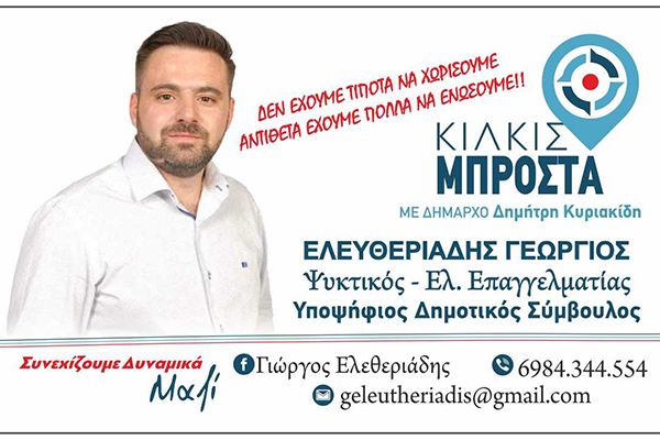 Ο ΓΙΩΡΓΟΣ ΕΛΕΥΘΕΡΙΑΔΗΣ υποψήφιος δημοτικός σύμβουλος με το ΚΙΛΚΙΣ ΜΠΡΟΣΤΑ και τον Δημήτρη ΚΥΡΙΑΚΙΔΗ