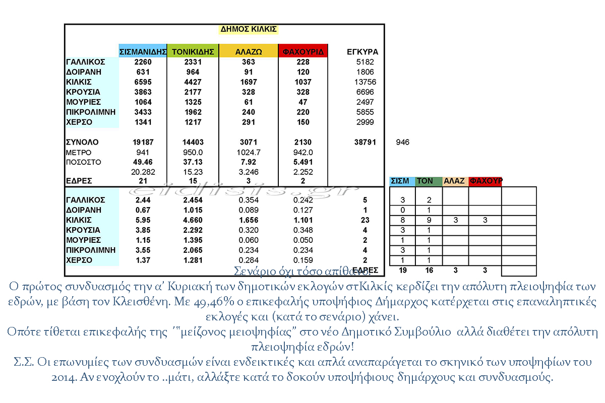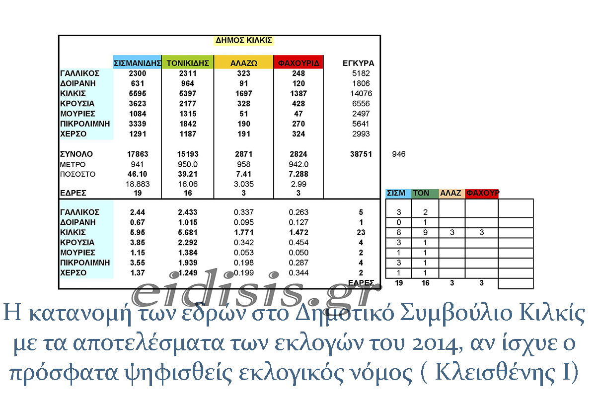 Είναι προφανές ότι νικητής συνδυασμός Σισμανίδη θα διέθετε μόνο 19 έδρες στο νέο συμβούλιο, όπως θα καταμεριζονταν από την πρώτη υριακή. Διότι ι εκλογές για την ανάδειξη συμβούλων τελειώνουν την πρώτη Κυριακή. Και κατανέμονται αναλογικά σε όλους τους συνδυασμούς, χωρίς να περισσεύει αριθμός εδρών προς κατανομή μεταξύ του νικητή και του δεύτερου των επαναληπτικών εκλογών. Οι επαναληπτικές εκλογές, εφόσον κανείς συνδυασμός δεν “πιάσει” το 50+1 από την πρώτη Κυριακή αφορούν μόνο στην εκλογή δημάρχου . Έτσι με το ίδιο εκλογικό αποτέλεσμα (2014) η σύνθεση του σώματος είναι τώρα και με τον εκλογικό νόμο: Σισμανίδης 25, Τονικίδης 13, Ρούσσου 2, Φαχουρίδης 1, ενώ με την απλή αναλογική η εικόνα θα ήταν: Σισμανίδης 19, Τονικίδης 16, Ρούσσου 3, Φαχουρίδης 3.
