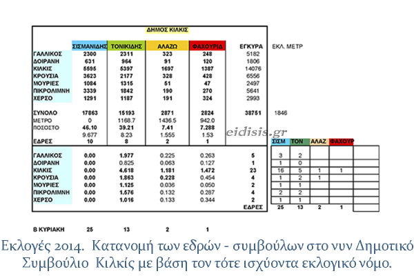 Στον δεύτερο πίνακα μεταφέρουμε τα αποτελέσματα των εκλογών του 2014 και καταγράφουμε πόσοι και απο ποια δημοτική ενότητα θα εκλέγονταν σύμβουλοι ανά συνδυασμό.