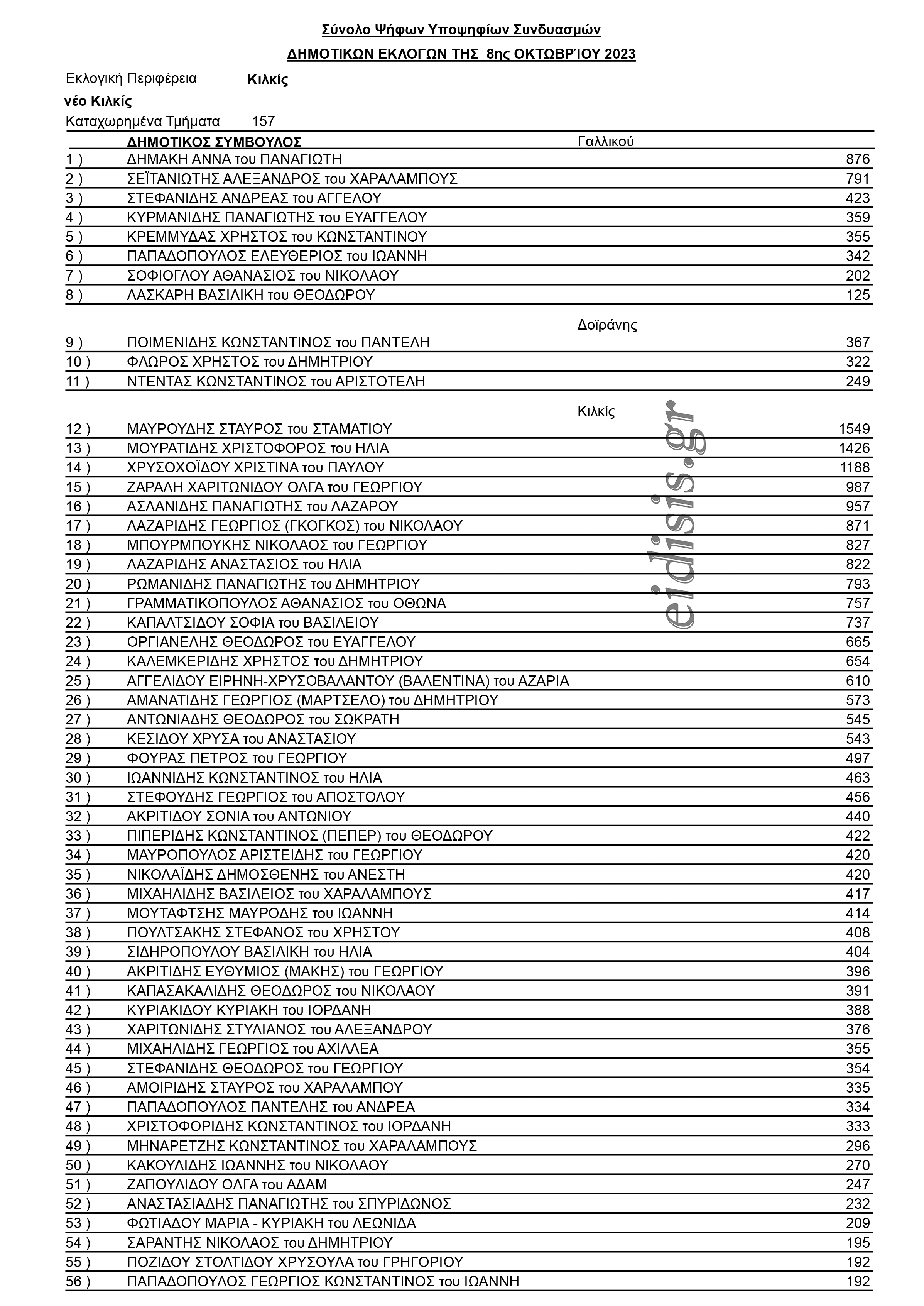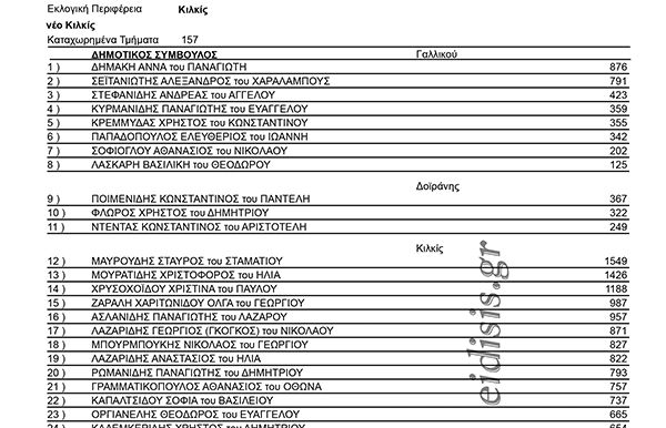 Με τα επίσημα αποτελέσματα όπως εκδόθηκαν από το Πρωτοδικείο Κιλκίς η σειρά κατάταξης σε σταυρούς προτίμησης των υποψηφίων δημοτικών συμβούλων του συνδυασμού «Νέο Κιλκίς» του κ. Θεόδωρου Βαφειάδη παρουσιάζονται στο σχετικό πίνακα στην έκθεση εικόνων