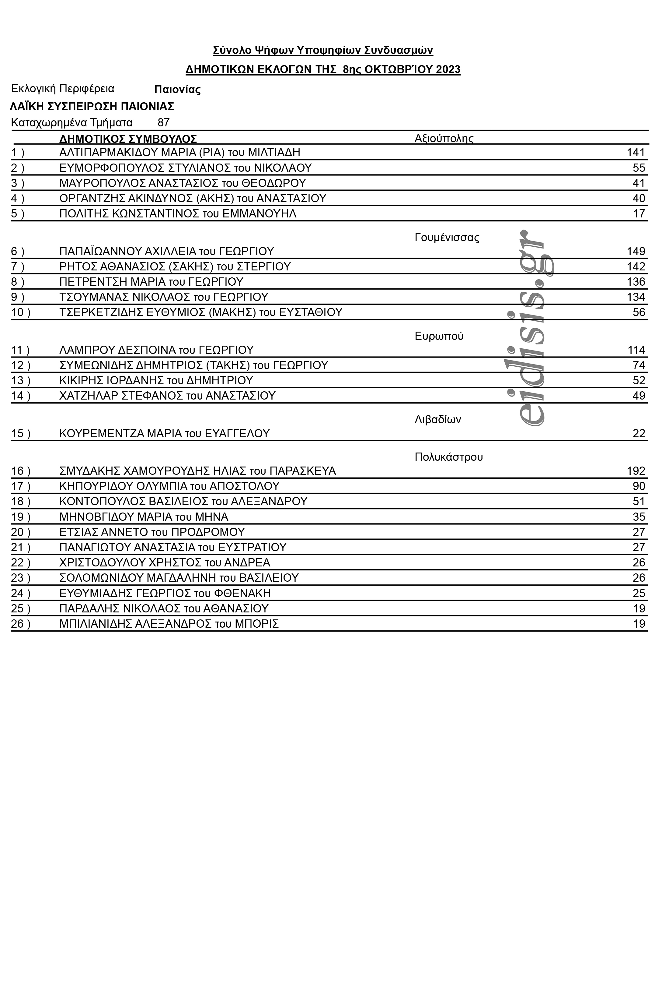 Οι σταυροί των υποψηφίων δημοτικών συμβούλων Παιονίας - Συνδυασμός Λαϊκής Συσπείρωσης