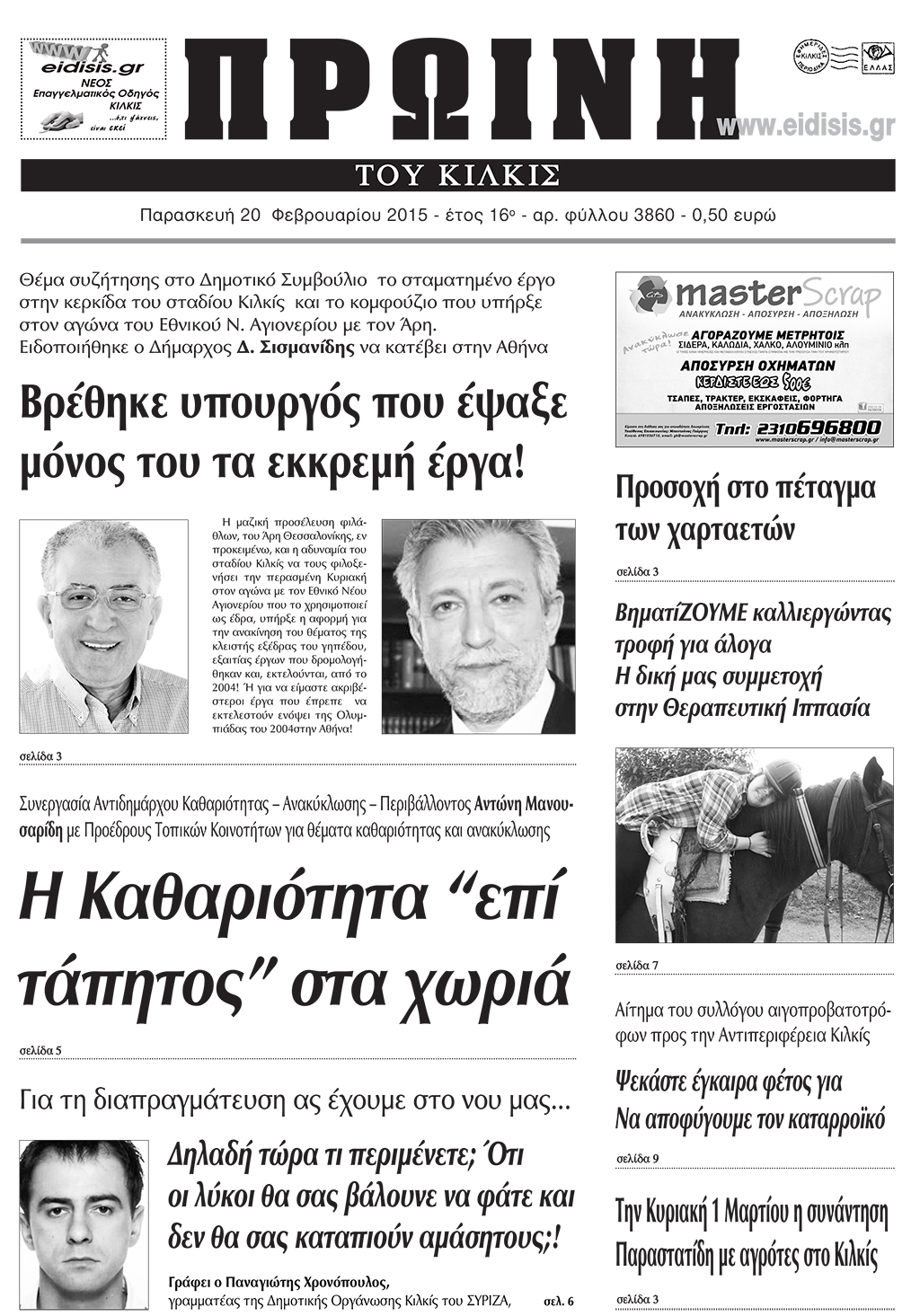 Πέντε χρόνια πριν. Διαβάστε τι έγραφε η καθημερινή εφημερίδα ΠΡΩΙΝΗ του Κιλκίς (20-2-2015)