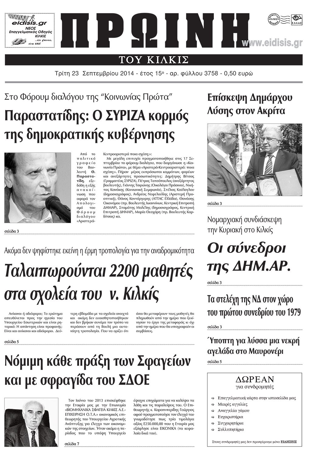 Πέντε χρόνια πριν. Διαβάστε τι έγραφε η καθημερινή εφημερίδα ΠΡΩΙΝΗ του Κιλκίς (23-9-2014)