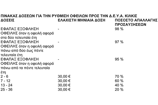 Καλούνται οι καταναλωτές της Δ.Ε.Υ.Α. Κιλκίς που έχουν συσσωρευμένες να προσέλθουν στα γραφεία της υπηρεσίας ώστε να ρυθμίζουν τις οφειλές τους με τον ανωτέρω ευνοϊκό τρόπο ρύθμισης.