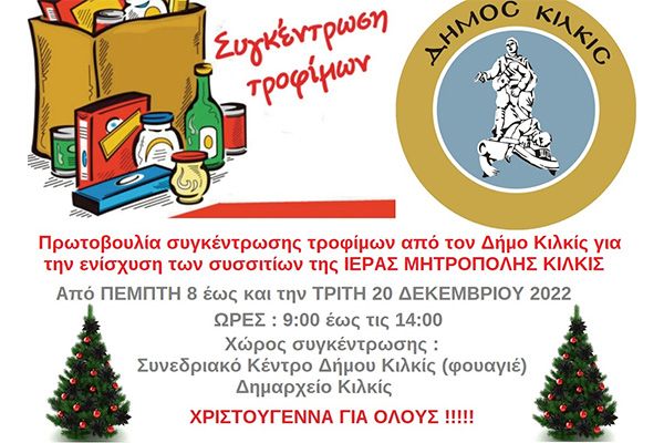 Από σήμερα Πέμπτη 8 Δεκεμβρίου και μέχρι την Τρίτη 20 Δεκεμβρίου, από τις 9:00 έως τις 14:00, στο φουαγιέ του Συνεδριακού Κέντρου του Δήμου Κιλκίς θα συγκεντρώνονται τρόφιμα μακράς διάρκειας. Ειδικότερα θα συλλέγονται όσπρια, ζυμαρικά, λάδι, σάλτσες, γάλα μακράς διαρκείας και τυροκομικά είδη (τυρί και κασέρι).