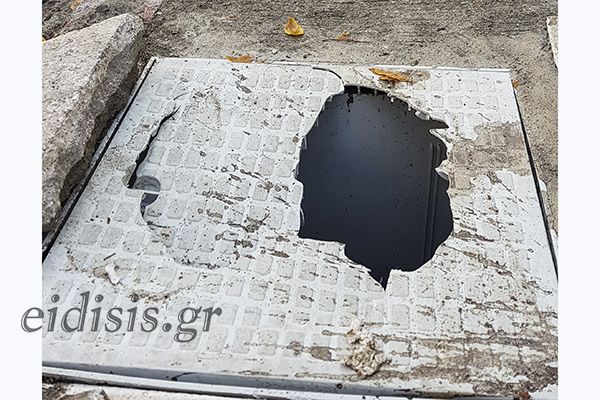 Στην κάτω φωτογραφία το φρεάτιο καλυμμένο με πρόχειρα σπαράγματα τσιμεντόπλακας από πολίτες της περιοχής. Για να προστατεύσουν εαυτούς και αλλήλους.